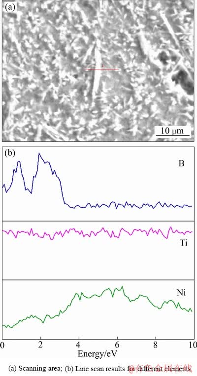 图4所示为Ni添加前后复合涂层横截面中部的SEM像。由图4可以看出,Ni添加前,复合涂层主要由颗粒与细针状组织构成,颗粒的平均尺寸为5~7 μm左右,细针状平均长度为12~15 μm左右,通过XRD和EPMA识别,发现颗粒和细针状分别为TiB2和TiB,如表4所示。而Ni添加后,复合涂层也主要由颗粒与细针状组织构成,但颗粒的数量和尺寸都呈下降趋势,颗粒的平均尺寸为3~5 μm左右。说明Ni添加明显提高了TiB2颗粒的溶解程度。细针状数量呈增多趋势,但细针状长度呈略微降低,细针状平均长度为8~10 μm左右。另外,由于Ti与NiTi的耐腐蚀性能差异小,而TiB与TiB2陶瓷相又很耐腐蚀。因此,采用EPMA线扫描进行分析,发现Ni元素与B元素的含量分布刚好呈相反趋势,结合XRD推测NiTi合金会分布在TiB周围,如图5所示。
