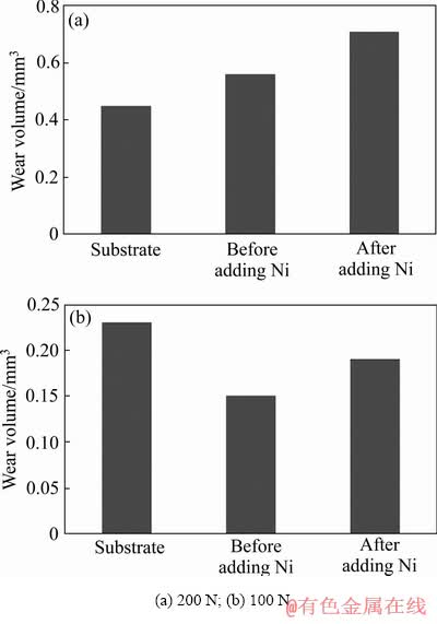 由前面分析可知,采用TiB2粉末和n(TiB2):n(Ni)= 1:1的粉末分别作为熔覆材料,在钛合金表面通过激光原位熔覆技术都能制备出TiB2颗粒和TiB短纤维增强钛基复合涂层,并且Ni的添加还可生成NiTi合金。图6所示为两种不同摩擦载荷下复合涂层和基体的磨损量。由图6可知,在高磨损载荷条件下(200 N),复合涂层的磨损体积都比基体大,并且Ni添加后,复合涂层的磨损体积更大。在低磨损载荷条件下(100 N),虽然复合涂层的磨损体积都比基体小,但Ni添加后, 复合涂层的磨损体积比Ni添加前的大。说明涂层中引入部分NiTi合金并不能改善微动磨损性能。