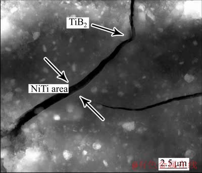 图7所示为添加Ni前后复合涂层在磨损载荷为100 N下磨痕形貌。由图7可知,Ni添加后,涂层表面的疲劳颗粒脱落面积变得更大。由此可更进一步表明涂层中NiTi合金的引入无法有效抵抗微动疲劳性能。这主要有3个方面的原因;1) 由于摩擦生热,并且微动磨损中磨屑不易排出,会导致摩擦接触区温度持续升高。从表5可知,摩擦区温度远超过132 ℃,而NiTi合金超弹性行为的有效温度区间为低于110 ℃下才能发挥明显作用[20]。2) 复合涂层中存在NiTi合金不能诱使裂纹扩展方向发生偏转。由图8可知,NiTi区周围的TiB2颗粒能明显改变裂纹扩展方向,但NiTi本身无法实现。其他研究者[21]也研究表明当使用温度高于应力诱发马氏体相变温度时,NiTi合金的裂纹扩展方向没有发生偏转。3) 当NiTi合金成为普通材料时,其硬度仅为241 HV0.2,比钛合金的硬度还低(330 HV0.2)。