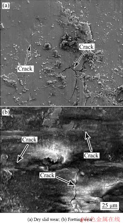 以上分析可知,干滑动磨损与微动磨损的差异,直观上表现为摩擦因数、温度与承载应力的不同。而从材料角度看,干滑动磨损过程与微动磨损过程出现的是磨屑排出、基体相塑性和氧化、接触区裂纹扩展的不同。