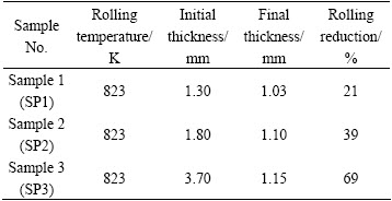 Commercial AZ31 (Mg-3Al-0.9Zn-0.3Mn) hot rolled magnesium sheets were used in this study. The thickness of initial sheets was 9 mm and the sheets were machined to the thickness of 1.2, 1.7 and 3.5 mm, respectively. The sheets were kept in thermal furnace for 10 min to reach rolling temperature and the rollers were heated to 573 K before rolling. All the sheets were rolled to 1 mm by single pass at 823 K. The rolling speed was 50 mm/s. The largest reduction of the rolling was nearly 70%, and the other two rolling reductions were 20% and 40%, respectively. The rolling parameters of three samples are listed in Table 1. After being rolled, the samples were immediately quenched into water to obtain the deformation microstructure.