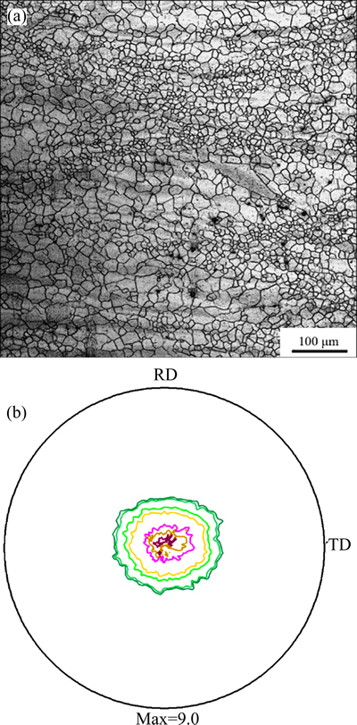 Figure 1(a) shows the optical micrograph of the as-received AZ31 alloy. Equiaxed grains with an average grain size of 10 μm were homogeneously distributed on both surface layer and middle layer of the sample. The starting material exhibited typical basal texture of the as-rolled alloy, as can be seen from the (0002) pole figure shown in Fig. 1(b).