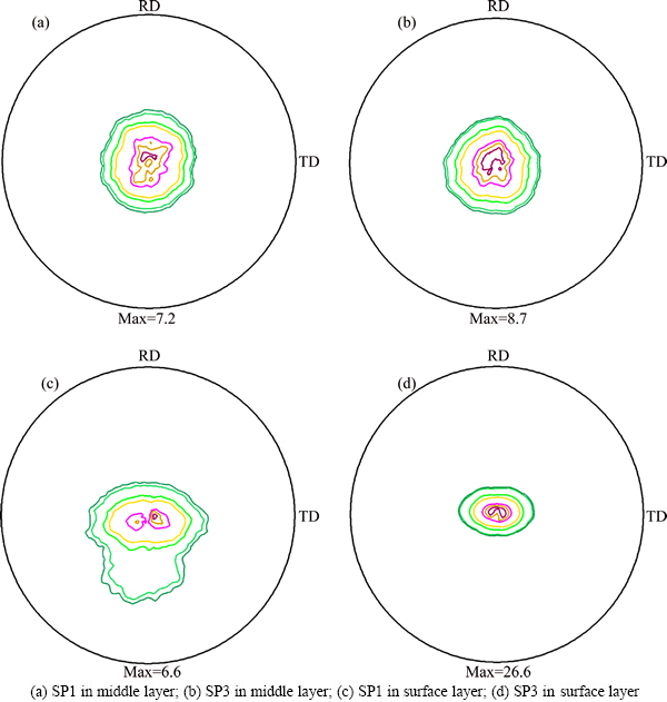 The macro-textures of the surface layer and mid-layer of all the samples were analyzed. The results of the SP1 and SP3 are shown in Fig. 5. After being rolled at 823 K, these samples were still basal texture in the middle layer of sheets. For the SP1, basal texture intensity decreased from 9.0 to 7.2, as presented in Fig. 5(a). This revealed that low strain rolling at high temperature could weaken the basal texture. The critical resolved shear stress (CRSS) of non-basal slip decreased at elevated temperature [15]. Therefore, the non-basal slip became an important deformation mechanism in this process. The recrystallized grains that absorbed non-basal dislocations would turn the basal orientation of lattice into random one [16]. The fraction of twins in the SP1 increased significantly compared with that in the initial sheet. Most of twins would be