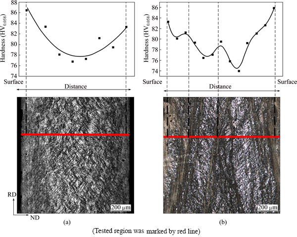 When the material undergoes flow localization, the homogeneity within the samples can be evaluated by microhardness measurements. Microhardness was measured on the SP1 and the SP3 along the red lines in Fig. 6. In the SP1, microhardness of the surface layer is higher than that in the center. The high microhardness of surface layer could be caused by work hardening effect, due to the large deformation. The work hardening decreased gradually from the surface to the center due to the heterogeneity of the deformation. In the SP3, microhardness was higher in both the surface layer and shear band region. Shear bands suffered severe plastic deformation, leading to the formation of ultrafine grains. These grains suffered severe deformation and attained high hardness throughout rolling process. Large strain hot rolling resulted in inhomogeneous microstructure and texture evolution.