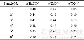 以工业级的 BaCO3 (纯度>99%,粒度4.2 μm)、ZrO2 (纯度>99%,粒度3.9 μm)和Y2O3 (纯度>99.9%,粒度4.8 μm)为原料,按表1中的比例配料。每组样品添加1%的TiO2作为助熔剂,球磨12 h后,将粉体在1200 ℃保温12 h,使用无水乙醇为介质球磨12 h,获得粉体样品。
