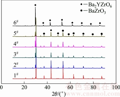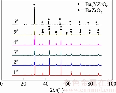 1)配比粉料1#~5#经固相合成后主要由BaZrO3和Ba2YZrO6组成,6#粉体则由Ba2YZrO6组成。