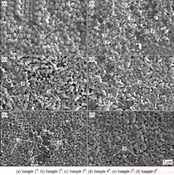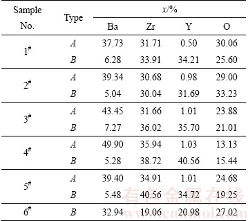图3所示为不同Y2O3掺杂BaZrO3圆片在1750 ℃保温6 h后的显微组织。从图3可看出,圆片1#~5#表面均由明暗度和尺寸不同的两种晶粒(A和B)构成,对晶粒A、B分别进行能谱(EDS)分析,其结果如表2所列。从表2可以看出,晶粒A中Y含量极少,Ba和Zr元素摩尔比约1:1,由此可知晶粒A为BaZrO3;而B晶粒中Zr和Y元素原子比约1:1,但Ba含量未达到Y(或Zr)含量的2倍,这可能是由能谱分析过程中存在的偏差所致。结合图4中陶瓷片1#~6#的表面XRD数据,可知圆片1#~5#中B晶粒为Ba2YZrO6。因为Ba2YZrO6为双钙钛矿结构,其点阵常数约为BaZrO3的两倍,因此两者衍射峰几乎重叠,同时,这也与图1中理论计算得到的单相区结论存在偏差。由图3(f)可知,圆片6#的表面晶粒大小均匀,形貌均一,结合表2中EDS结果,Ba、Zr、Y摩尔比近似于2:1:1,可知圆片6#由Ba2YZrO6构成。同时,从图3(a)~(e)可以看出,随着Y2O3掺杂量的增加,圆片中BaZrO3晶粒尺寸不断减小,且其晶粒呈现不规则形状。这是由于在高温烧结温度下,烧结机制受体扩散控制,氧缺位有利于固相传质的发生,促进晶粒生长;而Y2O3的掺杂抑制了氧缺位产生,因此抑制晶粒正常长大。这与齐建全[18]研究的Y2O3掺杂钛酸钡烧结机理类似。同时,Ba2YZrO6晶粒数量不断增加,并伴随团聚现象的出现,BaZrO3和Ba2YZrO6晶界发生变化,同时烧结后的陶瓷表面呈现明显的疏松多孔现象。刘向春等[19]指出,在烧结过程中,晶界与晶粒内部均有气孔存在,Y2O3的掺杂导致晶粒生长被抑制,晶粒生长速度小于晶界气孔移动速度,使得部分晶粒被气孔包围,因此陶瓷晶粒间晶界由规则的多面体转变为不规则的无定形的晶界时,会导致烧结后的陶瓷表面疏松多孔,这与本实验中出现的现象类似。