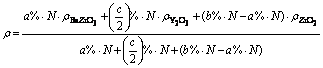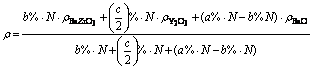 为考察不同Y2O3掺杂量对BaZrO3耐火材料造成的影响,对圆片样品1#~5#进行致密度分析。同时,为计算圆片致密化程度,在测定真密度的基础上,需考虑圆片的理论密度。但由于陶瓷片由BaZrO3和Ba2YZrO6两相共存,且无法准确确定两相的含量,为此建立Y2O3掺杂BaZrO3模型,假设BaCO3、ZrO2和YO1.5摩尔分数分别为a%、b%和c%,且3种物质总摩尔数为N。若n(BaCO3):n(ZrO2)>1,此时需要考虑剩余BaO(BaCO3分解生成)的理论密度,计算如公式(1)所示;若n(BaCO3):n(ZrO2)<1,此时需要考虑剩余ZrO2的理论密度,计算如公式(2)所示。其中BaZrO3、Y2O3、ZrO2和BaO的理论密度分别为6.23、5.01、5.89和5.98 g/cm3。