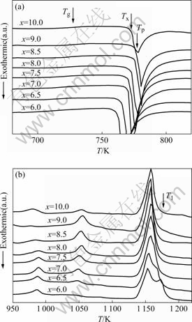 Fig.1 DSC curves of (Zr51.6Cu48.4)100?xAlx (x=6.0, 6.5, 7.0, 7.5, 8.0, 8.5, 9.0, 10.0) glassy alloys at heating rate of 20 K/min: (a) 650 K<T<850 K, (b) 950 K<T<1 250 K