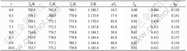 表1 非晶合金(Zr51.6Cu48.4)100?xAlx (x=6.0, 6.5, 7.0, 7.5, 8.0, 8.5, 9.0, 10.0)的热分析结果