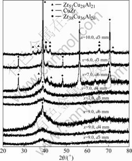 速凝固过程,使得其CuZr相的析出和长大受到了抑制。但当加入的铝过量(x=10.0)后,非晶形成能力急剧降低,即使直径为3 mm的样品,晶化也很严重,主要析出相变为以CuZr相为主的多种晶相共存状态。