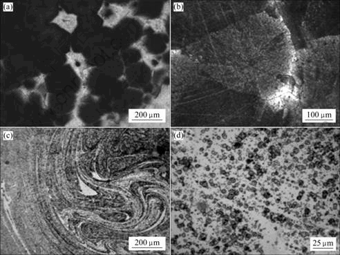 Fig.3 Optical micrographs of ZrCuAl alloys with diameter of 6 mm: (a), (b) x=7.0; (c), (d) x=9.0