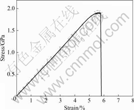 图4所示为Zr47Cu44Al9大块非晶合金的室温压缩曲线。从图4可以看出,试样在压缩过程中,在经历一定的弹性变形后出现0.5%左右的塑性变形,然后断裂,其抗压断裂强度为1.9 GPa。这两个指标比大多数的晶态金属材料的相应指标高出很多,因此,这些 非晶材料可以在很高的应力条件下承受较大的弹性形变,可以作为高强度、高弹性、高耐蚀性材料使用。