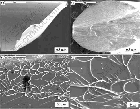 Fig.5 Fracture morphologies of Zr47Cu44Al9 bulk metallic glasses: (a) Side view of fracture surface; (b) Panorama of fracture surface; (c) Vein patterns on franture surface; (d) Higher magnification image for vein patterns
