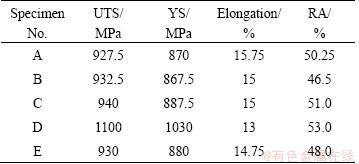 The tensile properties of specimens B, C, D and E are summarized in Table 3. For comparison, the tensile property of an additional specimen (marked as A) which had gone through deformation (940 °C, 60%, AC) without heat treatment is also listed. As shown in Table 3, after different heat treatments, the tensile strength increases but elongation decreases with different contents. For specimen B, the ultimate strength (UTS) is 932.5 MPa, which has only a slight edge to that of the specimen A, while the yield strength (YS), elongation, reduction of area (RA) are not as high as those of specimen A. When the specimen D went through, the UTS increases greatly from 927.5 MPa to 1100 MPa, and the YS increases from 870 MPa to 1030 MPa, while the reduction of area increases slightly from 50.25% to 53%, and elongation decreases from 15.75% to 13% which is the lowest among all these treatments. When the cooling rate decreases (air cooling ) after high temperature aging at 930 °C in the duplex annealing compared with solution treatment (water cooling), the strength declines but is still superior to that of specimen A, with UTS, YS, elongation, reduction of area 940MPa, 887.5MPa, 15%, 51%, respectively. Triple annealing has not enhanced the property so much, improving only a little of strength, but decreasing the ductility.
