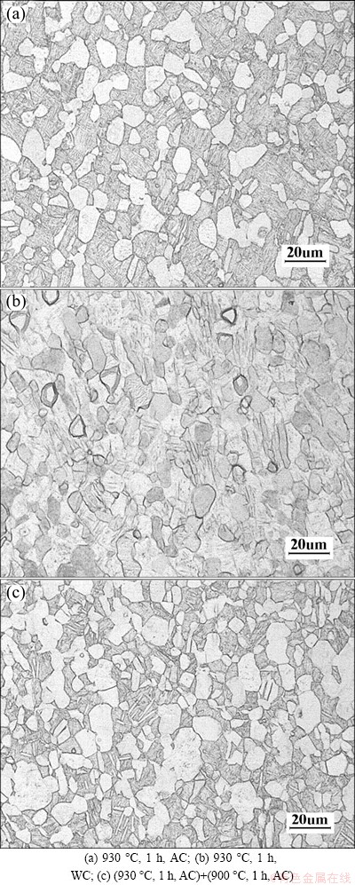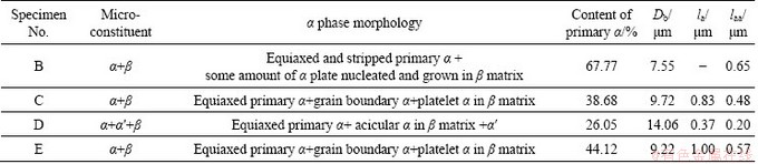 Quantitative test was conducted through image analysis software and microstructure features including micro-constituents and morphology, primary α content (area fraction of primary α phase) and prior-β grain size, Db, grain boundary α width, la, secondary α thickness, laa, in the primary β matrix at different heat treatment conditions are summarized in Table 4. However, la in the specimen B was not confirmed due to its special microstructure characteristics. From Table 4, it can be concluded that the volume fraction of primary α and the sizes of α and β are mainly determined by the annealing temperature and cooling rate, and the same result was also obtained by SEMIATIN et al [8], while the width of secondary α and grain boundary α is mainly determined by the cooling rate [15,16] and the low temperature aging. It can be seen from Table 4 that higher annealing and aging temperature and lower cooling rate lead to the decrease of the volume fraction of primary α and the size of prior-β and the increase of the width of grain boundary α and secondary α.