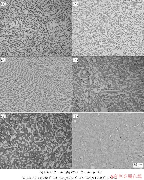 图2所示为BTi-6431S合金单重退火后的金相组织。样品经850 ℃退火后,初生α相含量(体积分数)高达76%,呈板条状,提高退火温度,初生α相逐渐趋于等轴化。由图2可知,随着退火温度的升高,初生α相的体积分数有所变化,经850~940 ℃退火后,初生α相体积分数约为70%,变化不明显,但在960~ 1 000 ℃下退火时,初生α相体积分数大幅减少,由940 ℃时的70%下降到980 ℃时的43%,经1 000 ℃退火后,在晶界处已观察不到初生α相。说明退火温度越接近相变点,该合金的初生α相体积分数对温度越敏感。而对于次生α相,在850~940 ℃下退火,转变得到的β相体积分数少,空冷过程中转变的次生α相少且细小;而当退火温度升高到960和980 ℃时,原子的扩散系数增加,初生α相向β相转变的数量增多,使得β相中的Al含量升高,在随后空冷过程中,退火温度高的β相中Al通过短程扩散生成次生α相,次生α相优先在α/β界面上析出,通过界面迁移长大[9]。