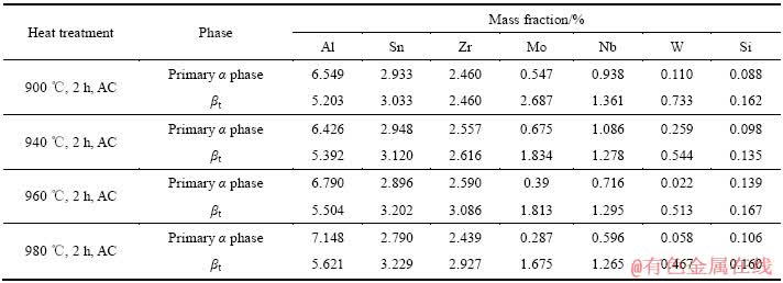 采用电子探针对热处理后的试样中各相进行成分分析,如表2所列。试样中初生α相中的Al含量均高于βt的,而Nb、Mo、W的含量都明显低于βt的。随退火温度的升高,βt中Al含量升高,而Nb、Mo和W的含量降低。说明在退火过程中,原来固溶在α相中的Al通过扩散进入β相中,温度越高则元素扩散系数越大,初生α转变为β相的速率增加,得到更多的β相;同时β相中β稳定元素含量的减少降低了β相的稳定性,有利于空冷过程中β相向次生α相转变,使得次生α相体积分数增加,这与图2观察到的结果相一致。
