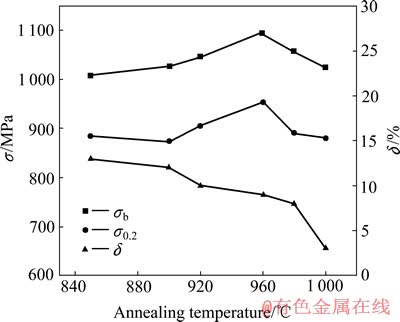 由图2可知,合金在850~960 ℃退火时,初生α相向β相发生转变,随着退火温度的升高,β相体积分数增加,使得α相与β相之间的相界面数目增加,有利于提高材料的界面强度;并且次生α相体积分数增加,细小的次生α相起到了弥散强化的作用。但当温度升高到980 ℃后,晶粒尺寸发生长大,减少了相界面的面积,合金强度降低。