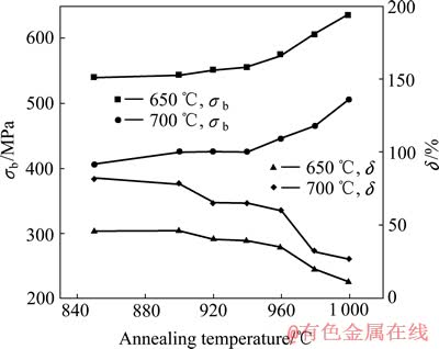 Fig. 4 Relationships among annealing temperature and tensile properties of alloys at 650 and 700 ℃