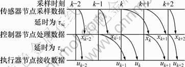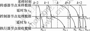 在时间驱动传输模式中,接收节点在固定周期内必然要接收1个状态或控制数据。如果在1个周期内2个或多个数据同时到达,接收节点就会选取时刻较近的数据,从而造成数据丢弃;另一方面,如果在1个周期内没有数据传输过来,那么,相应节点就会保持前一时刻的历史值,造成空采样。这2种情况都会造成数据丢包。例如图1中,对于第k+2时刻的控制器节点和第k+1时刻的执行器节点,因为传感器信息xk与xk+1同时到达控制器,控制信号uk-1与uk同时到达执行器节点,接收节点选取较近xk+1和uk,那么,传感器信息xk和控制信号uk-1发生了丢弃现象;而第k+1时刻的控制器节点和第k时刻的执行器节点因为没有新数据到达,相应节点就会保持前一时刻的历史值xk-1和uk-2,导致出现空采样现象。