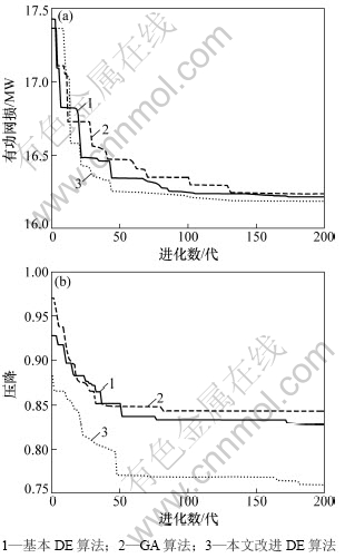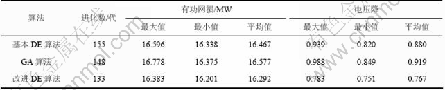 图4 基本DE算法、GA算法和改进DE算法的网损及压降收敛曲线