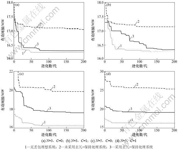 为了进一步分析去冗-保持处理方法对于数据丢包问题的有效性,设定IEEE30系统存在不可控变量数目N及不可测变量数目C分别为如下4种情况: (a) N=3,C=0;(b) N=3,C=1;(c) N=5,C=0;(d) N=5,C=1;且结合本文改进DE算法分别针对无数据丢包理想系统、未采用去冗-保持处理系统、采用去冗-保持处理系统的网损分别进行仿真计算,结果如图5所示。仿真结果表明: