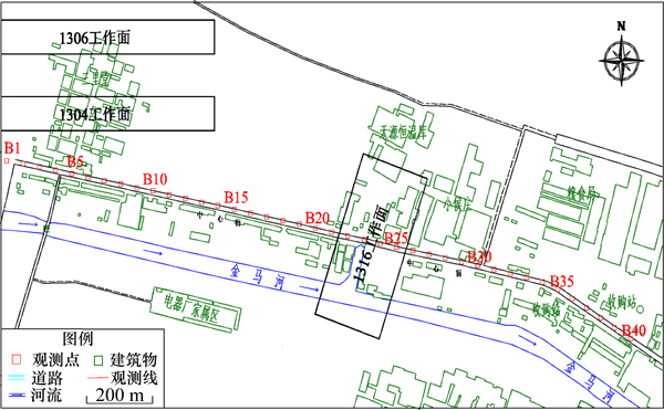 本次试验地点为山东花园煤矿。该矿位于济宁市金乡县境内,北距济宁市区约48 km,南距商丘90 km。1316充填面位于井田东翼,属二叠系山西组,煤层平均采高为3.0 m,平均埋深为550 m,煤层平均倾角12°,工作面走向长度为220 m,倾向长度为100 m,总体呈近似东西走向的单斜构造。为揭示矸石密实充填开采后地表沉降特征,特在1316工作面上方布设1条观测线,如图4所示。