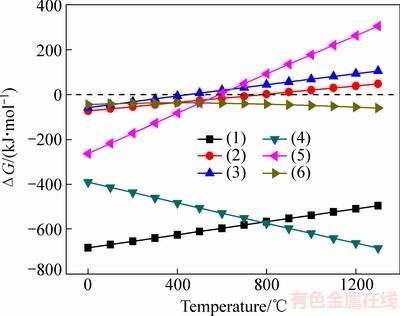 使用HSC热力学软件绘制以上各反应的吉布斯自由能与温度关系曲线如图1所示。
