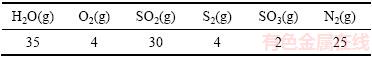 在实际生产过程中,由于富氧熔炼物料炉内分解、反应物分布不均匀等情况,烟气中通常存在一定量的S2(g)和SO3(g)。为保证研究工作的准确性,本实验中以铜富氧底吹熔池熔炼工艺为研究对象,通过采集生产数据,分析得出铜富氧底吹熔池熔炼烟气主要组成成分为H2O(g)、O2(g)、SO2(g)、SO3(g)、S2(g)、N2(g)等(为方便计算,其他气体按N2(g)计),具体含量如表1所示。