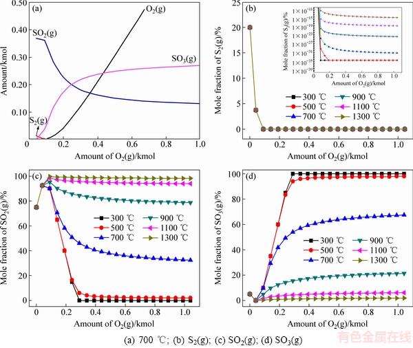 本文作者采用模拟计算方法研究烟气各组分随温度变化而发生的各化学反应及组分含量变化。为便于计算,设定研究对象为1 kmol烟气,其中O2(g)的量为0.04 kmol,S2(g)的量为0.04 kmol,SO2(g)的量为0.3 kmol,SO3(g)的量为0.02 kmol,其余为N2(g)。此外,为保证与实际生产烟道漏气情形一致,设定模拟过程中O2(g)的量以0.05 kmol梯度增加。