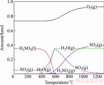 图6所示为不同H2O(g)的量下H2SO4(l)含量的变化曲线。由图6可知,在烟气硫元素总摩尔量一定的情况下,H2SO4(l)含量随着H2O(g)的量的增大而增大,当温度为300 ℃、H2O(g)的量为0.55 kmol时,烟气中SO3(g)最大发生率为1.2%,H2SO4(l)最大含量占总硫量的99%;而当温度为300 ℃、H2O(g)含量为0.15 kmol时,SO3(g)最大发生率为62.5%,H2SO4(l)含量占总硫量的10%。结果表明,烟气中O2(g)和H2O(g)的量对H2SO4(l)产生量有重要影响,在控制O2(g)以保证较低SO3(g)发生率的同时,需要降低H2O(g)的量以减少H2SO4(l)产生,从而降低烟道腐蚀情况。烟气H2O(g)的量主要由熔炼物料含水量决定,因此可通过晾晒、蒸汽烘干等手段控制物料含水量,降低烟气H2O(g)的量,从根源上减少烟气中H2SO4(l)的产生。