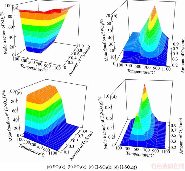 以上分析表明,温度对烟气中SO3(g)发生率有重要影响。温度越低,烟气SO3(g)生成量越大,发生率越高;温度越高,SO3(g)的生成受到抑制,如温度为900 ℃、O2(g)的量为0.09 kmol时,SO3(g)含量即发生率为4.85%;而当温度为1100和1300 ℃时,SO3(g)发生率为1.51%和0.36%。