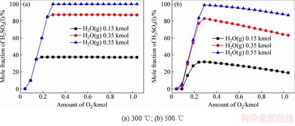 进一步分析不同H2O(g)的量对烟气含硫组分含量影响,取H2O(g)的量分别为0.15、0.35和0.55 kmol,绘制了温度为300和500 ℃时H2SO4(l)含量的变化曲线。