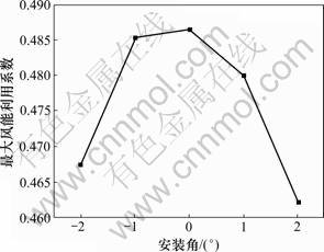 安装角在-2°~2°之间变化时,会引起风力机叶片最大风能利用系数发生变化,如图3所示。从图3可见:当安装角从-2°逐渐向2°变化时,风力机叶片的最大风能利用系数呈现了先增大后下降的变化特征,并且在安装角为0°时最大风能利用系数最高,达到0.486。安装角的正偏或负偏都会引起风力机叶片最大风能利用系数下降,为了使风力机叶片尽可能多发电,选择本款风力机叶片安装角为0°进行分析。