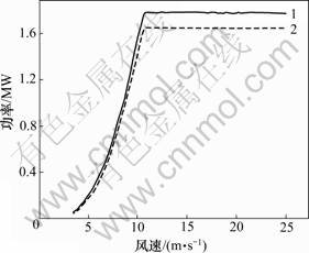 风力机叶片在上述应用条件下的气动功率计算结果如图4所示,图中实线表示风轮输入的轴功率,虚线表示风力发电机组输出的电功率。风力发电机组在满功率时的功率传递效率取93%。从图4可见:当该款风力机叶片在风速为11.0 m/s时,可达到风力发电机组气动额定功率1.65 MW,满足设计要求。