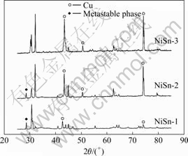 The XRD patterns of the as-deposited Sn-Ni alloy electrodes are shown in Fig.1. As expected for samples prepared for electrodeposition, the peaks of all samples can be ascribed to both Ni3Sn4 phase and NixSny metastable phase according to literature data[14]. The diffraction peak at 28? disappeared in NiSn-3 sample, which should be due to the result of reaction at 200 ℃. From the X-ray fluorescence spectroscope, the Sn-Ni alloy electrode was composed of 71% Sn and 29% Ni (in mass fraction), which should be corresponding to Ni3Sn4 according to the molar ratio.