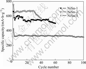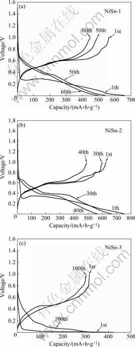 The electrochemical performances of the three samples are also shown in Fig.5. The first discharge capacity of NiSn-2 electrode is the highest, but the capacity fading begins from the 30th cycle. The first discharge capacity of NiSn-3 electrode is the lowest, but it delivers a steady capacity (314 mA?h/g) even after 100 cycles.