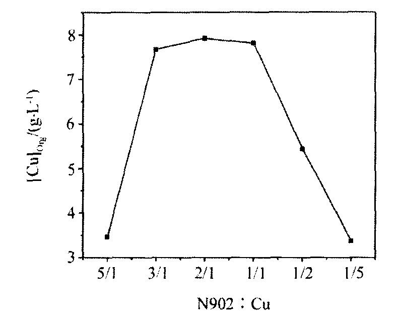 1. 用30%的N902萃取盐酸介质中的铜, 当铜的浓度为8.5