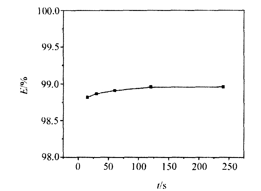 用30%N902萃取[Cu2+ ]=8.5 g·L-1 , [Cl- ]=0.3 mol·L-1 , pH=3的铜溶液, 测定不同振荡时间下铜的萃取率, 结果如图2。由图2可知, 随着时间的增加, 萃取率逐渐增大, 当时间为120 s时, 萃取率已达98.96%, 基本平衡。 说明N902萃取铜是快速反应。