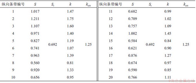 接下来进行条带均匀性评价。首先计算各纵向条带的一致性统计量k,然后在95%置信水平下,查阅F分布表,并计算得到纵向条带一致性检验临界值kcrit为1.25,结果如表6所示。