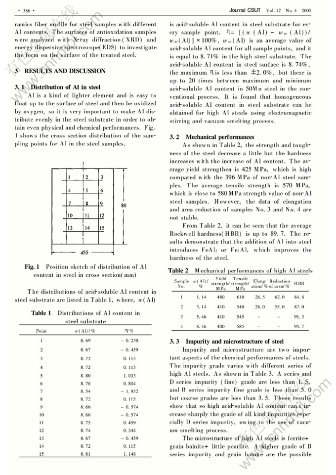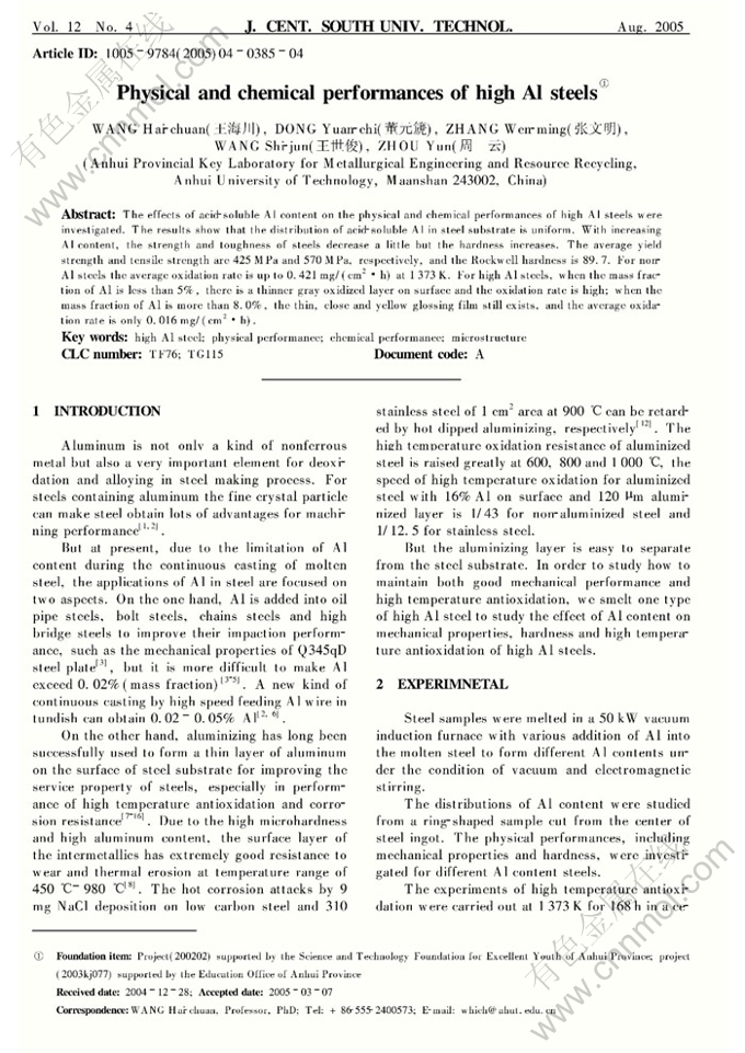 Key words:high Al steel; physical performance; chemical performance; microstructure