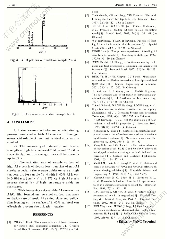 Abstract: The effects of acid-soluble Al content on the physical and chemical performances of high Al steels were investigated. The results show that the distribution of acid-soluble Al in steel substrate is uniform. With increasing Al content, the strength and toughness of steels decrease a little but the hardness increases. The average yield strength and tensile strength are 425 MPa and 570 MPa, respectively, and the Rockwell hardness is 89.7. For non- Al steels the average oxidation rate is up to 0.421 mg/(cm2·h) at 1 373 K. For high Al steels, when the mass fraction of Al is less than 5%, there is a thinner gray oxidized layer on surface and the oxidation rate is high; when the mass fraction of Al is more than 8.0%, the thin, close and yellow glossing film still exists, and the average oxidation rate is only 0.016 mg/(cm2·h).