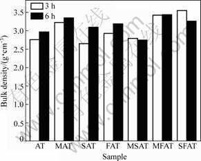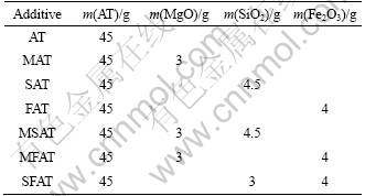 The equimolar mixtures of α-Al2O3 and TiO2, with different additives, were thoroughly mixed through ball milling for about 10 h and then dried at 105 °C until the moisture content was below 2% (mass fraction). The compound powders were then uniaxially pressed into bars of 30 mm×5 mm×5 mm at the pressure of 200 MPa. After pressing, the samples were sintered at 1 500 °C and the calcination durations were 3 h and 6 h respectively for the purpose of comparison. The heating rate was 10 °C/min and the cooling rate was 5 °C/min, and there was a stage of 30 min at the temperature of 600 °C to volatilize the cohesive material in the samples.