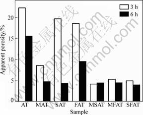 Figure 1 shows bulk density of samples with different additives. When sintered for 3 h, the bulk density of MAT ceramic with single additive MgO is increased greatly compared with AT ceramic without any additive. The other ceramics with other single additives seem to be no obvious change in the bulk density. However, when extending the sintering time to 6 h, it can be seen that the bulk densities of all ceramics with single additives are increased. This result indicates that the sintering duration influences the bulk density. When compound additives are doped into AT ceramics, it is evident that the bulk density of MFAT and SFAT ceramics are increased, but the bulk density of MSAT ceramic is the same as the original AT ceramic. Figure 2 exhibits the change of apparent porosity of samples with different additives. It should be noticed that the MgO-doped is more effective to reduce the apparent porosity and enhance bulk density than addition of SiO2 or Fe2O3. For example, the apparent porosity of MAT ceramic sintered for 3 h is only 8% while the apparent porosity of SAT or FAT ceramic is nearly 20%. The finding of apparent porosity is good agreement with the measurement of the bulk density except for SAT and FAT ceramics sintered for 3 h.