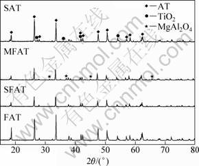 Bulk density and apparent porosity can be used to evaluate the influence of additives on the sintering properties of AT ceramics. The role of additives in AT ceramics commonly lies in promoting or accelerating the process of sintering. In general, additives act as active components which can reduce the energy required for sintering through forming solid solution or liquid phases as well as compounds with Al2O3-TiO2 mixtures [13]. Since different electrovalence between cations of additives and Al3+ or Ti4+ results in numerous passages for solid-state reaction and promotes the process of sintering, additives with different electrovalences and different cation radii show remarkable difference in calcination process. Thus the bulk density of ceramics is usually improved during sintering process. For example, the cation radius of Mg2+ is about 0.057 nm, which is similar to the cation radius of Al3+(0.054 nm); the cation radii of Si4+ and Fe3+ are 0.026 nm and 0.064 nm, respectively. This may be the main reason for the higher bulk density of MAT ceramics compared with SAT and FAT.