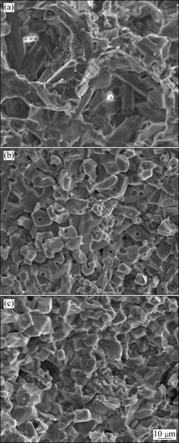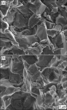 Thermal shock resistance of AT ceramics was estimated with the methods of thermal cycling at the temperatures ranging from 1 000 °C to room temperature and the specimens were quenched in the air. After 10 cycles, there is no phenomenon of crack or failure in all of the specimens. The bulk density as well as the apparent porosity shows little or no difference with samples without thermal shock tests. After thermal cycling, the three-point bending tests were performed on the specimens. It is observed that the mechanical strength is improved a little for the samples after thermal cycling, as illustrated in Table 4. But the fracture surface seems to be similar with that without thermal cycling (Fig. 8). Improvement of mechanical strength after thermal cycling should be related to microcracks which can absorb the strain energy and delay the failure of the specimens.