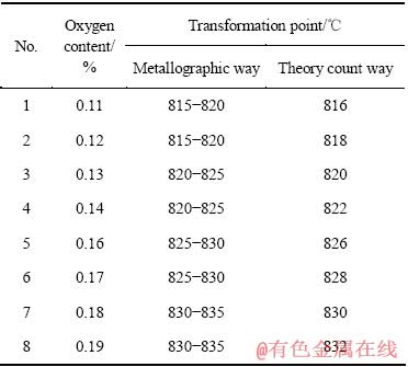 1) 随着氧含量的增加,TB8钛合金的相变点明显升高,平均氧含量每增加0.01%,合金相变点升高2 ℃左右。