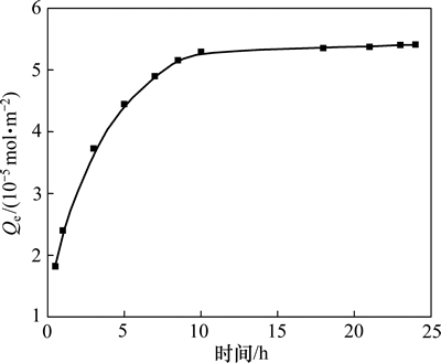 在DiPODECTU初始浓度为5×10-5 mol/L,温度为298 K时,黄铜矿对DiPODECTU的吸附量随时间变化的关系如图1所示,由图1可知:黄铜矿对DiPODECTU的吸附量随着吸附时间的延长而增大,在吸附过程开始的0~10 h内,黄铜矿对DiPODECTU的吸附速率最大,吸附量增长最快。吸附10 h之后,随着时间的延长,吸附量增加变缓,12 h时吸附量基本达到饱和,再延长吸附时间,吸附量没有明显的提高。