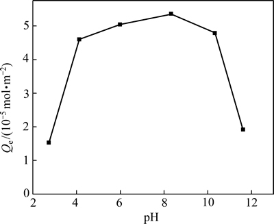 在吸附时间为12 h,温度为298 K时,溶液pH对黄铜矿吸附DiPODECTU的影响见图2。图2表明:随着pH的增加,黄铜矿对DiPODECTU的吸附量先增加后减少,pH约为8.5时达到最大。当pH为5~10时,DiPODECTU在黄铜矿表面的吸附量较大,强酸性或强碱性条件下都不利于其在黄铜矿表面的吸附。
